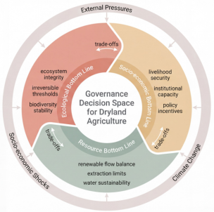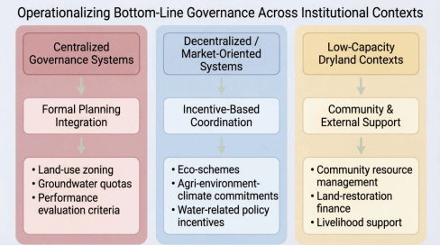 在此基础上,论文进一步探讨了“底线治理”在不同制度环境中的实践路径。研究认为,在集中型治理体系下,可通过国土空间分区、永久基本农田划定、地下水配额管理以及生态绩效考核等方式,将底线原则嵌入土地利用决策;在市场导向型治理体系下,可借助生态补贴、农业环境承诺、资源使用激励等政策工具推动底线治理落地;在治理能力相对薄弱的干旱区,则可依托社区资源管理、土地修复项目以及生计支持措施等方式,逐步推进农业利用与生态修复的协调转型。该研究表明,干旱区农业可持续发展并不存在单一治理模式,而是需要根据不同区域的治理结构和资源环境条件,构建差异化的制度路径。