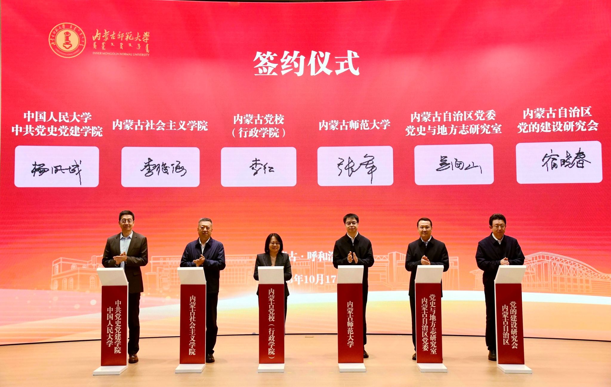 内蒙古师范大学党委副书记、校长张军,内蒙古党校(行政学院)副校长(副院长)、校务委员李红,自治区党委党史和地方志研究室副主任吴海山,内蒙古社会主义学院党组成员、副院长李俊海,内蒙古自治区党的建设研究会秘书长宿晓春,中国人民大学中共党史党建学院院长、中国中共党史学会副会长杨凤城签署合作框架协议