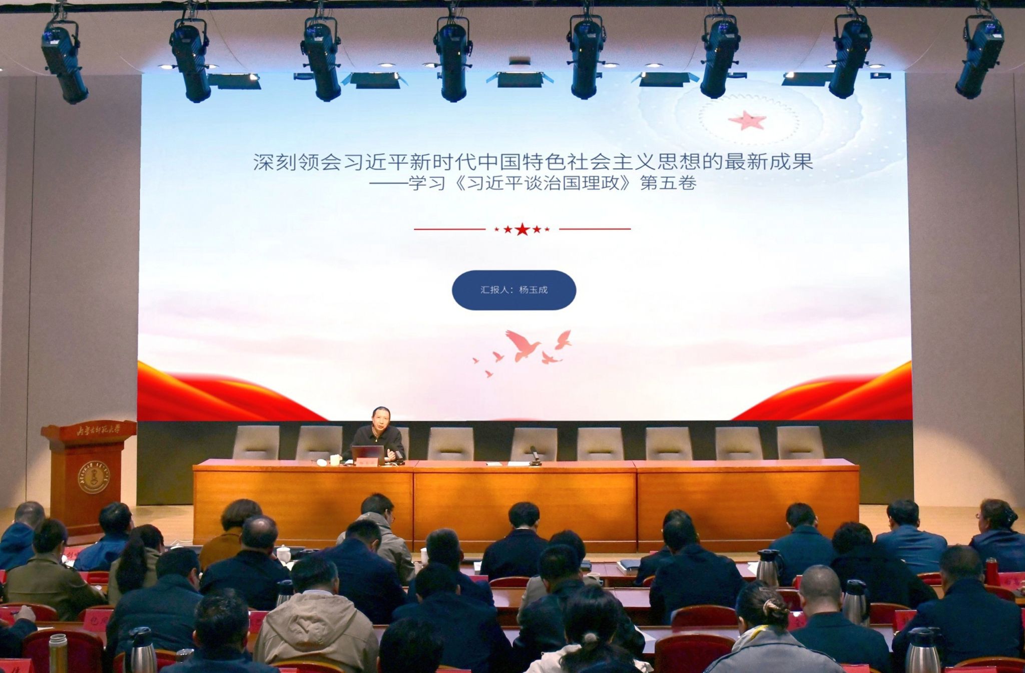 本网讯 10月22日下午,学校党委理论学习中心组(扩大)集体学习会在赛罕校区信息楼学术交流中心报告厅举行。中央党校哲学部教研室主任,我校党委委员、副校长杨玉成以“习近平新时代中国特色社会主义思想最新成果——学习《习近平谈治国理政》第五卷”为题作专题辅导。校党委理论学习中心组成员、全校副处级以上干部参加学习会。党委副书记斯钦主持学习会。