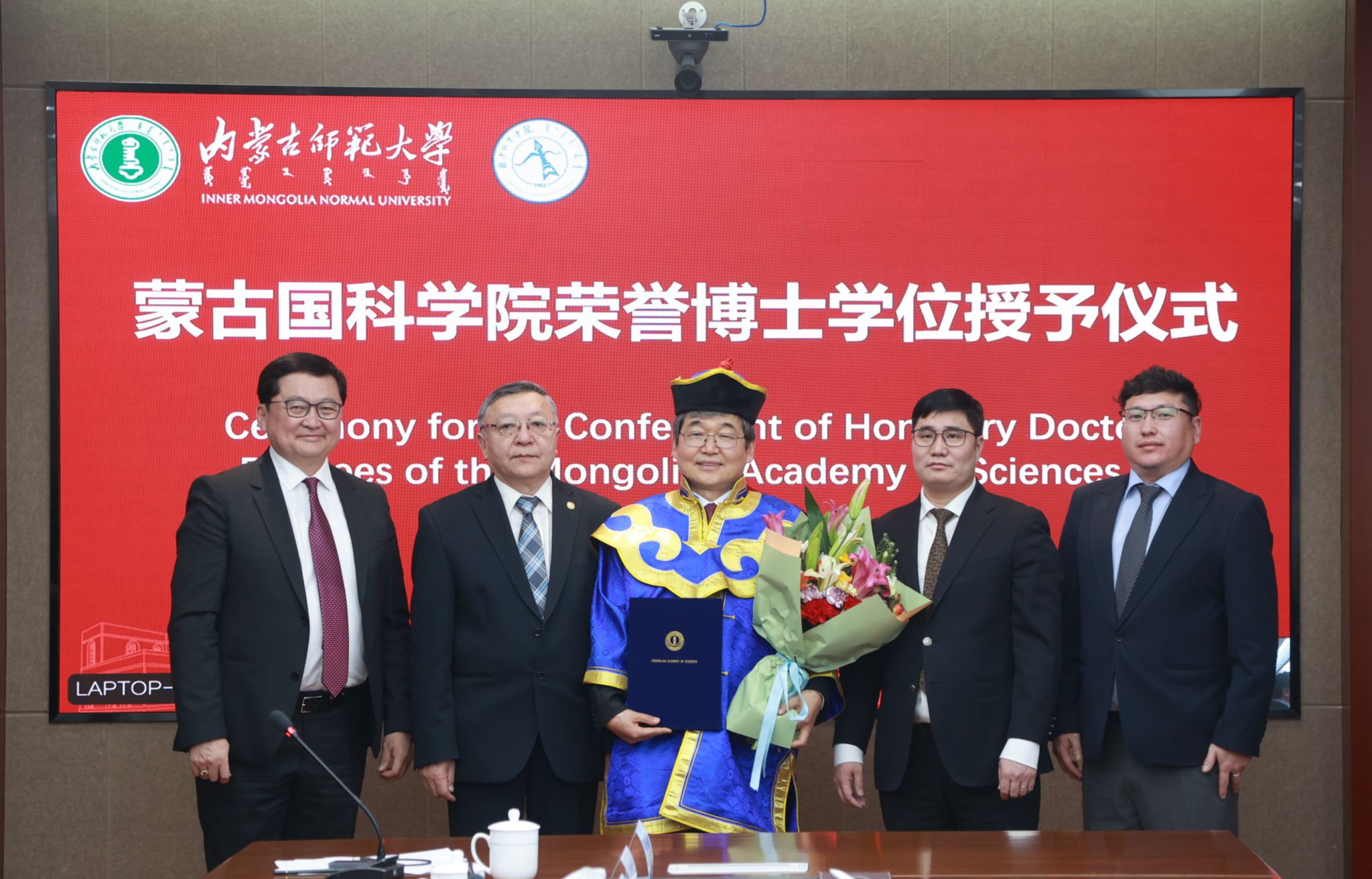 本网讯 1月13日,中蒙应用数学交流研讨会暨蒙古国科学院荣誉博士学位授予仪式在内蒙古师范大学举行。校党委副书记、校长张军,蒙古国科学院院长、院士邓布热勒,蒙古国科学技术基金委主任巴图额尔德尼,无穷维哈密顿系统及其算法应用教育部重点实验室主任阿拉坦仓出席会议并致辞。校党委委员、副校长公茂果主持会议。蒙古国科学院院士恩赫巴图、蒙古国科学院办公室主任巴雅尔巴特尔、蒙古国科学院数学与数字技术研究所所长蒙克额尔德尼、内蒙古自治区科学技术厅外国专家局(科技合作处)局长(处长)佟永兴、我校相关部门负责同志、数学科学学院领导班子成员以及师生代表参加会议。