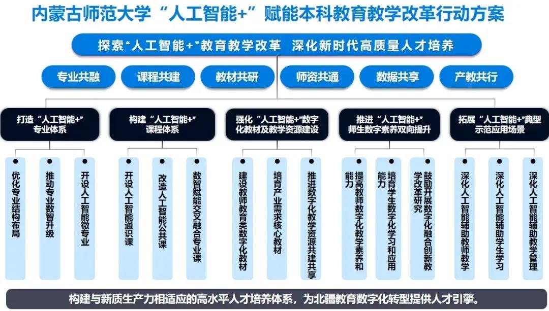 前瞻布局教育数字化转型战略,以智慧教学引领教育教学系统性变革。建成拥有自主知识产权的“内师在线教育管理平台”,应用案例获中国高等教育学会“校企合作双百计划”典型案例认定,并获批中国教育技术协会首届数字教育示范案例优秀案例。2025年初发布《“人工智能+”赋能本科教育教学改革行动方案》,系统谋划“专业体系+课程体系+资源建设+素养提升+场景应用”的“五位一体”布局,细化15项关键举措。获批自治区“人工智能+教育”试点改革任务3项,建设校级智慧课程23门、人工智能通识课14门,开设人工智能在线选修课30门。通过“机制+平台+空间”一体化建设,成功构筑“数智赋能、融合创新”的智慧教学新生态,为实现更高水平的教育教学智能化升级奠定了坚实基础。