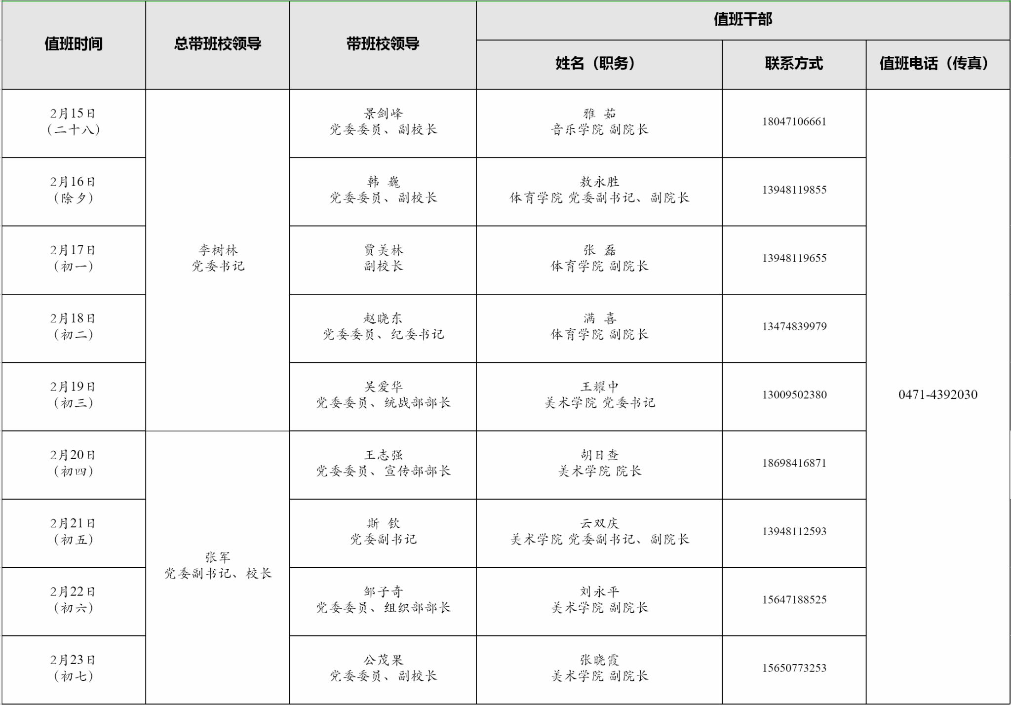 内蒙古师范大学春节期间领导干部带班处级干部值班安排表(24小时)