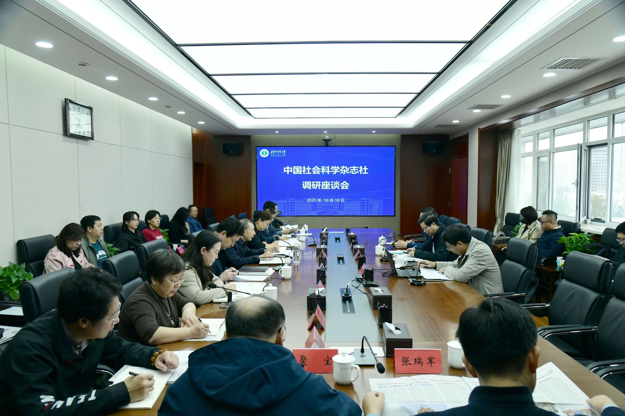 杨玉成从历史沿革、办学特色、学科布局与特色领域等方面介绍了学校的基本情况。中国社会科学杂志社有关负责同志介绍了中国社会科学杂志社所属“九刊两报一网”情况,并就期刊栏目设置、重点选题以及发行、订阅等进行了说明。我校社会科学处有关负责同志介绍了学校社会科学工作及科研立项、科研平台、智库建设、科研团队、科研成果、科研特色等方面情况。与会同志围绕提升跨学科研究能力、增强学科创新能力、加快学科建设进展、组织开展学术活动等议题进行了充分交流。
