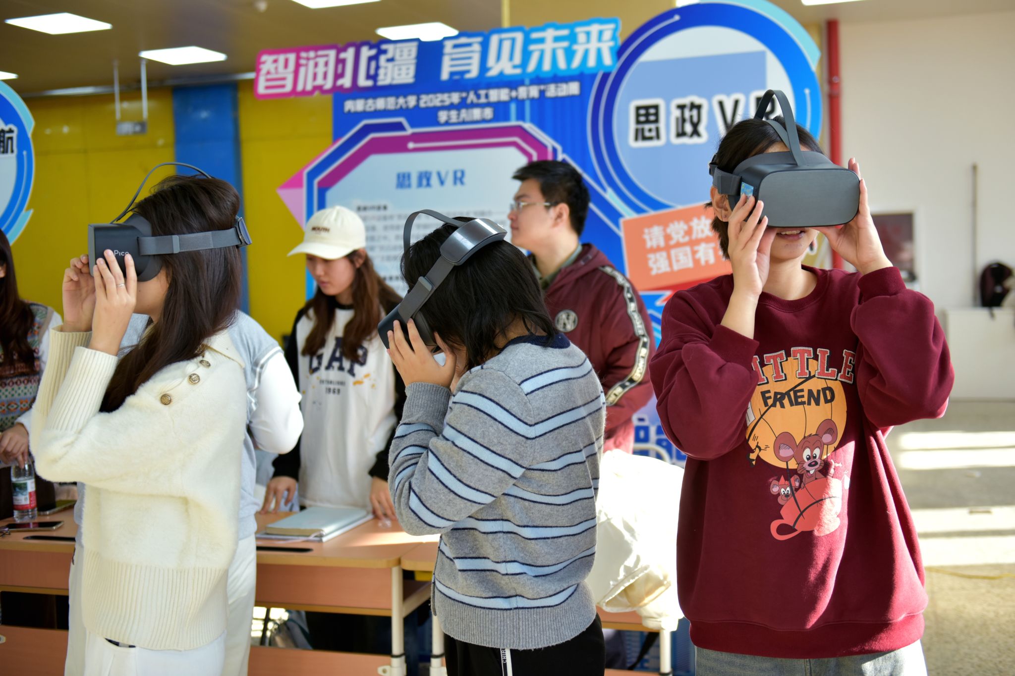 在互动体验区,师生通过体验AI绘画等趣味应用,感受技术激发创造力的过程。在“思政VR体验区”,同学们戴上VR眼镜,体验“红军长征”“抗日战争”“解放战争”等重大历史事件的模拟场景,获得了超越传统教学的沉浸式学习体验。