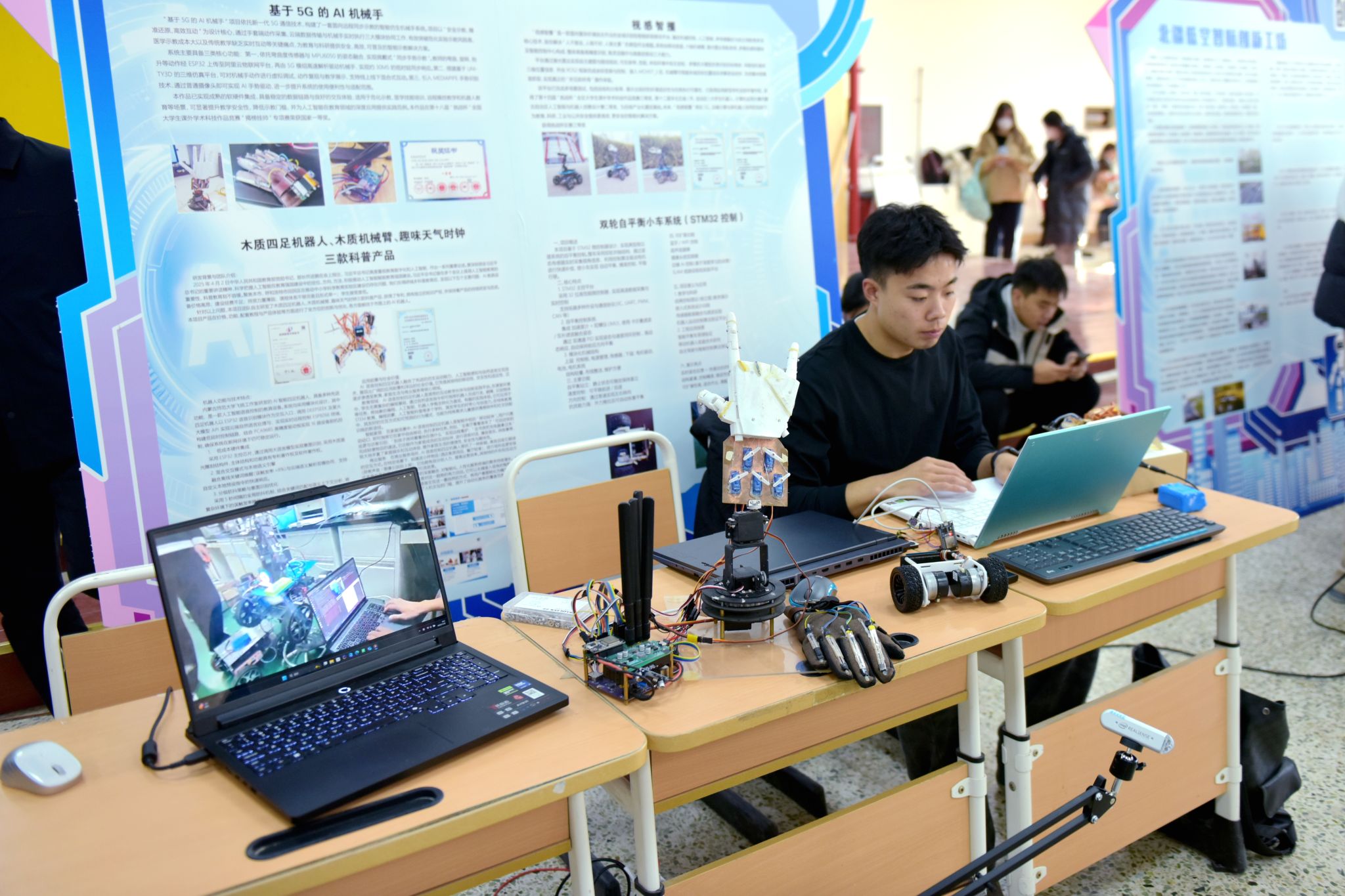 活动现场,各类 AI 创新作品亮点纷呈。在应用展示区,各团队分别展示并讲解了仿生机器人、四足仿生机器人(机器狗)、轮腿自平衡机器人、无人机、“基于5G的AI机械手”等作品,直观呈现了技术成果和人工智能的应用前景。在AI心理咨询展位,同学们通过AI学工智能交互系统体验心理测评与疏导服务,感受科技赋能心理健康教育的温暖力量。在AI信息素养展区,智能检索、数据可视化等技术应用演示,展示了人工智能在提升学习效率方面的应用价值。