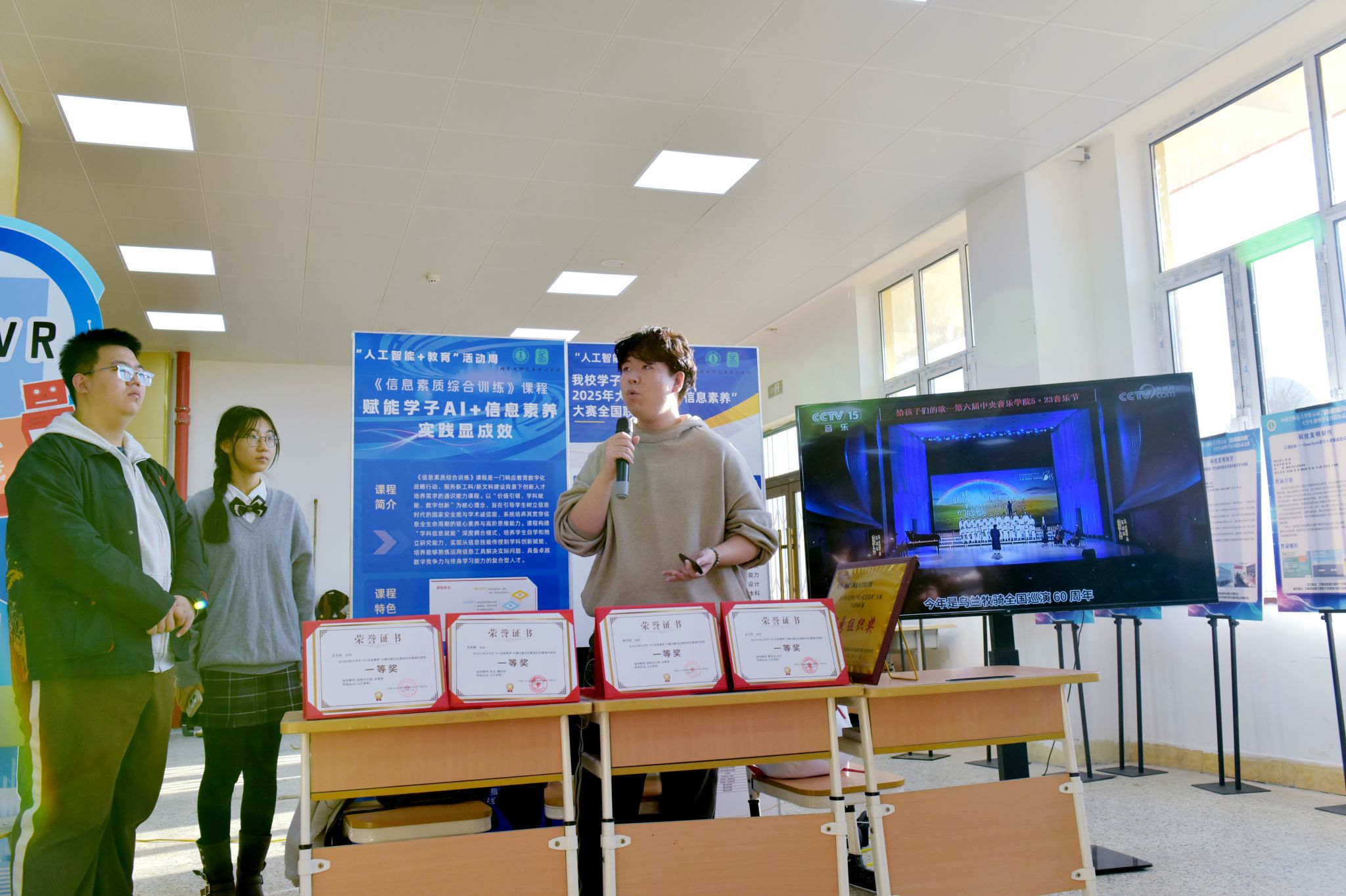 在竞赛成果展区,“AI遗旅逸游·格斯尔史诗引擎”“美岱召:三娘子的繁花文化绘卷——用AIGC+文旅助力传播北疆文化印记”等学校首届“AI+文旅”创意设计大赛优秀作品,体现了AI技术赋能文旅产业的成效。“AI+信息素养大赛”优秀作品的展示,体现了大学生在AI技术赋能下信息处理与创新应用能力的提升。“挑战杯”大学生课外学术科技作品竞赛科技发明作品展区集中展示了我校学生在科技创新领域的创新成果。