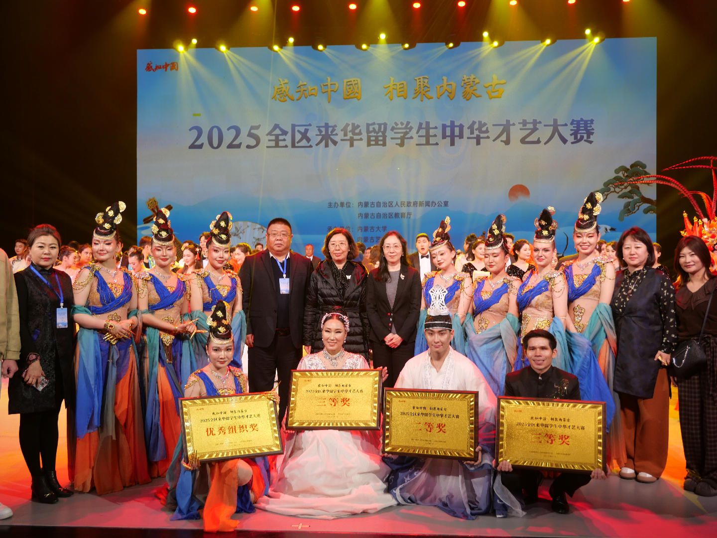 本网讯 11月30日晚,由内蒙古自治区人民政府新闻办公室、内蒙古自治区教育厅联合主办的“感知中国 相聚内蒙古”2025全区来华留学生中华才艺大赛决赛暨颁奖仪式在内蒙古艺术剧院举行。我校荣获二等奖1项、三等奖2项和“优秀组织奖”。副校长贾美林出席活动。