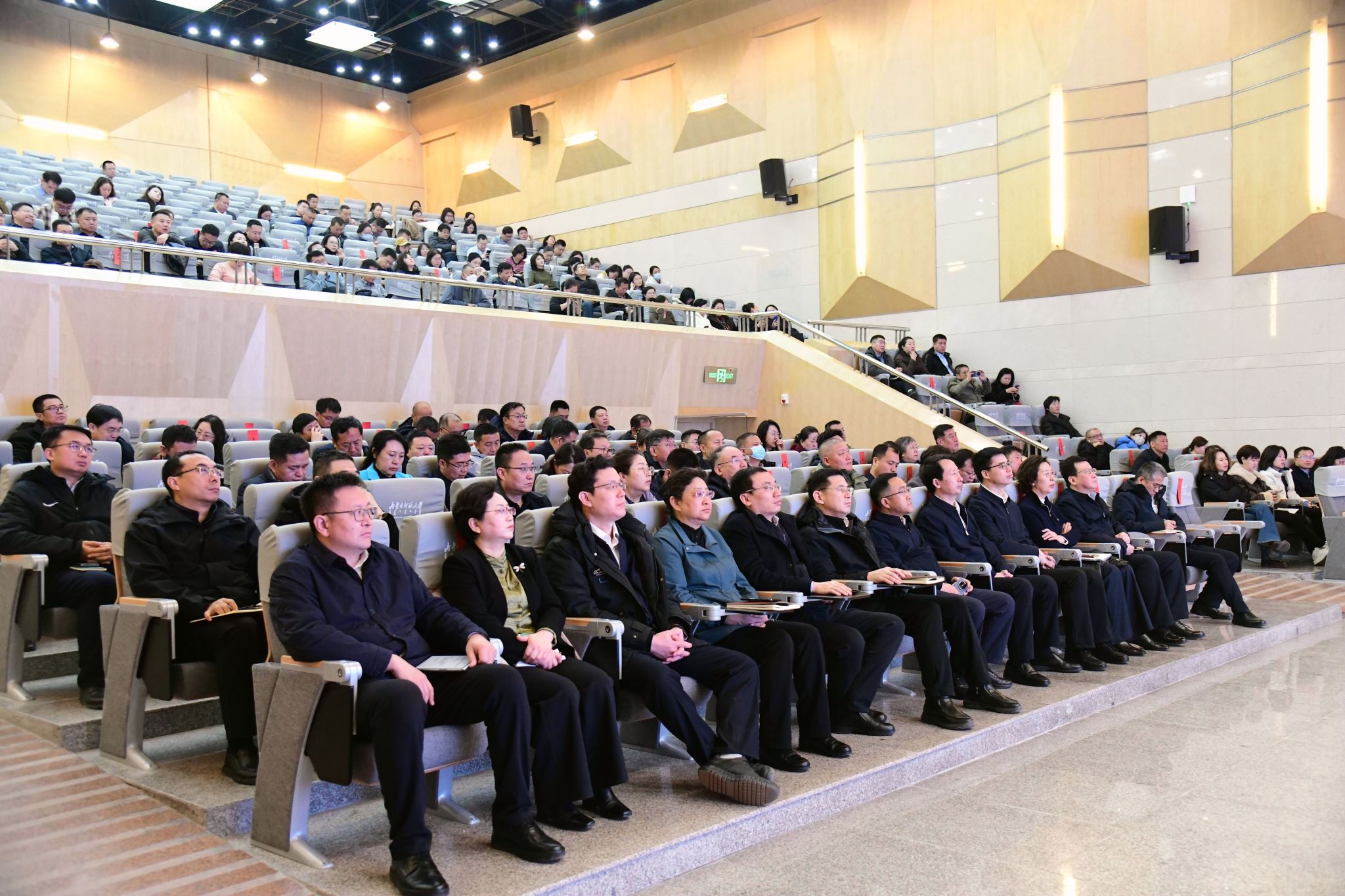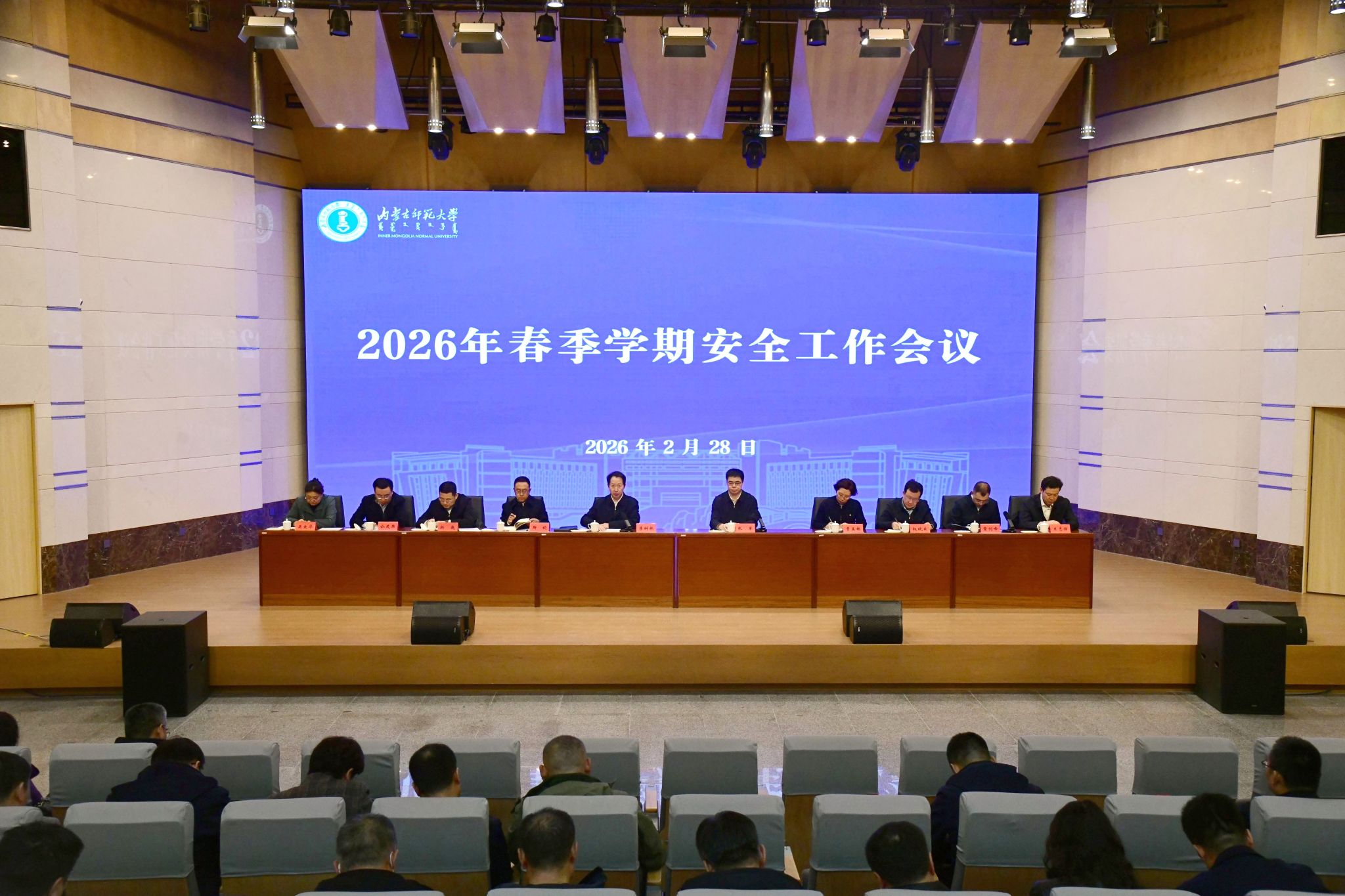 本网讯 2月28日上午,内蒙古师范大学2026年春季学期安全工作会议在赛罕校区逸夫艺术楼报告厅召开。党委书记李树林出席会议并讲话,党委副书记、校长张军主持会议,全体在家校领导、全校副处级以上干部出席会议。各职能、教辅部门办公室负责人,后勤企业党委副科级以上干部及重点岗位负责人,各学院办公室、团总支、学工办、实验室负责人参加会议。