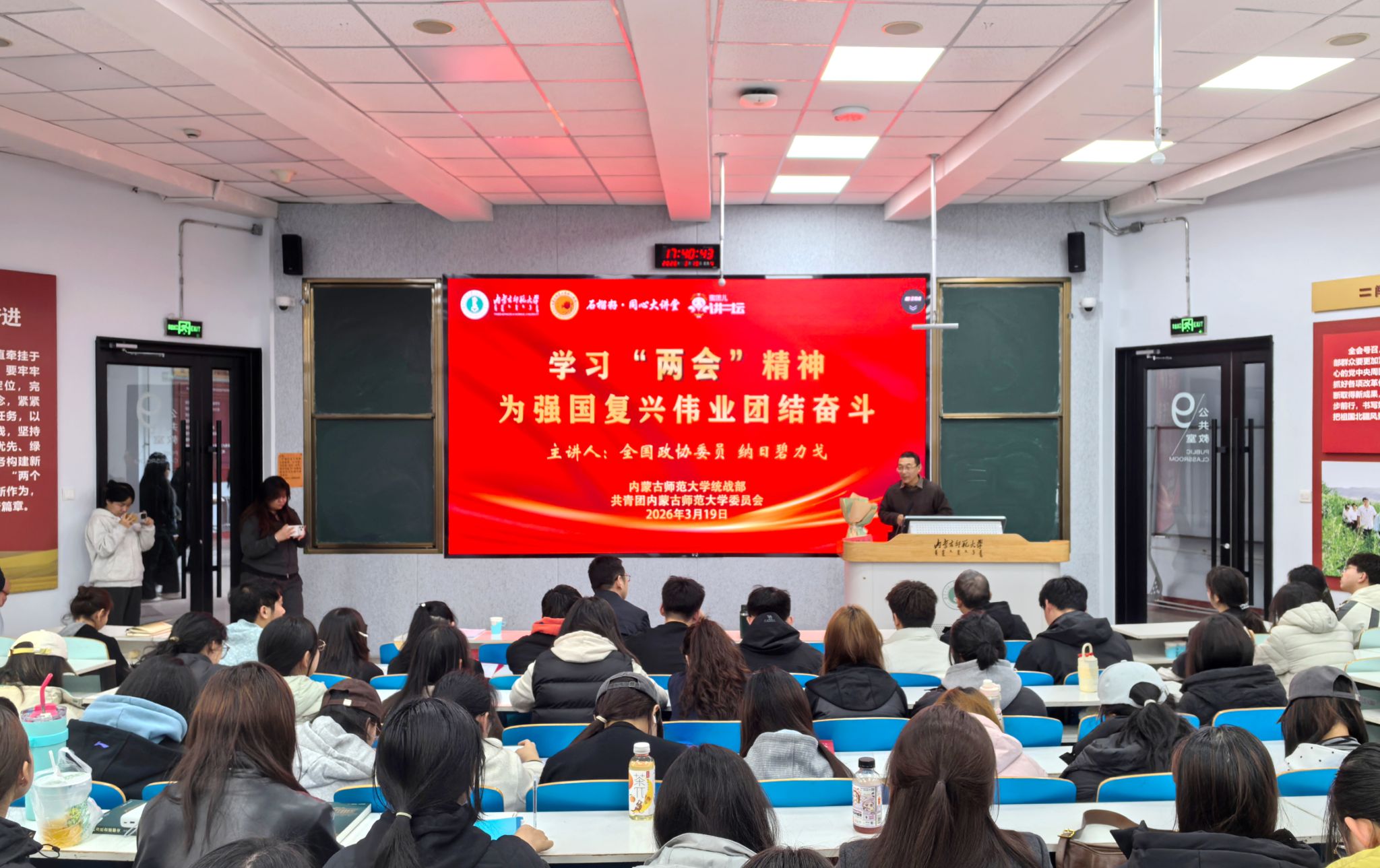 纳日碧力戈结合参加全国两会的亲身经历和履职感悟,向青年学子们详细解读了政府工作报告、政协常委会工作报告等相关内容,传达了习近平总书记在两会期间参加江苏代表团审议和政协联组会议时的重要讲话精神。他对《中华人民共和国民族团结进步促进法》(以下简称民族团结进步促进法)进行了深入解读,并指出,该法是新时代党的民族工作法治化的重要成果,是铸牢中华民族共同体意识的制度保障,与全国两会精神中关于“为强国复兴伟业团结奋斗”的部署一脉相承。他谈到,强国复兴离不开各族人民的团结奋斗,而民族团结进步促进法正是以法治力量夯实团结奋斗的制度基石,是推动各民族共同走向现代化的重要法律保障。他通过生动的语言和鲜活的案例,将国家大政方针与青年成长成才紧密结合,引导广大学子深刻领会两会精神的核心要义与实践要求。