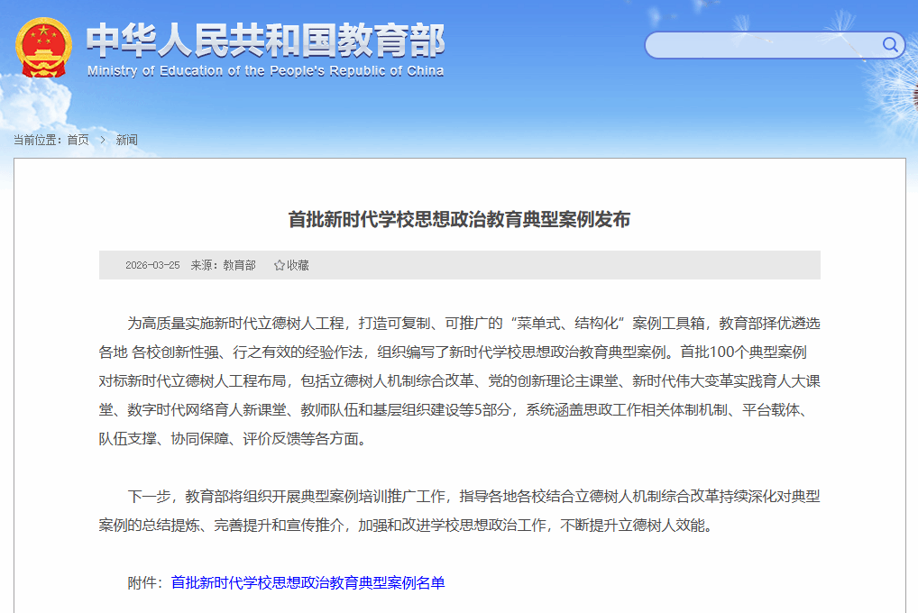 点击查看中华人民共和国教育部政府门户网站“首批新时代学校思想政治教育典型案例发布”原文